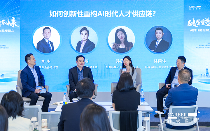 圆桌讨论环节,由南宫28国际业务总经理李华主持,开利亚太总部招聘总监邹羽、招商局集团资深AI产品经理孙敬萍、南宫28国际人力资源总经理陆同伟三位专家,分别从外资、央国企和民企视角,围绕AI时代人才供应链创新性重构话题展开深度对话。