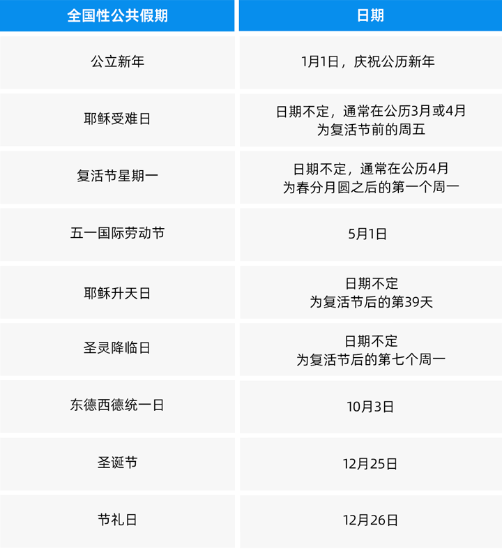 德国共有9个公共假日。作为联邦制国家,德国不同地区有额外假日,因此公共假日总计有10-13天不等。